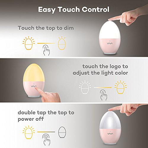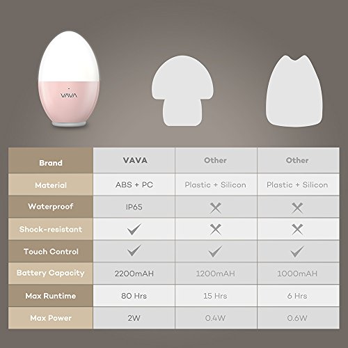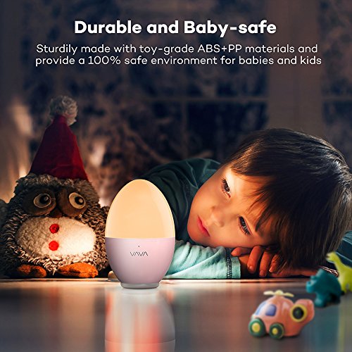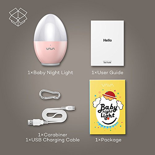 Studio : VAVA Publisher : VAVA Binding : Kitchen Product Description Made for Your Child Designed to be handled (and mishandled) by your kids, the VAVA LED Children Night Light is sturdily made from top-grade ABS and PP plastic to create a 100% safe playing environment for your children. Eye-caring LED Using energy efficient LED to create a uniform, non-flickering light that is easy on the eyes, even for children. Whether you are reading a bedtime story to your children or cuddling a baby to asleep, the light will be just right with its adjustable brightness and color. Learn to Control Let your children interact with the light and have fun playing with its friendly controls: Touch the top to dim the light, touch the logo to adjust its brightness, and double tap to power on/off. Great for Kids and Parents When fully recharged, the light can last as long as 80 hours in weak mode. It is best suited for children's all night companion to keep them feel safe, or for new moms who has to wake up in the middle of the night to give breastfeed. IP65 Waterproof With a portable size, light weight, and IP65 waterproof design, your kids can take the light as far as they can: hiking trip, family adventure, or simply camping at home backyards. 0
