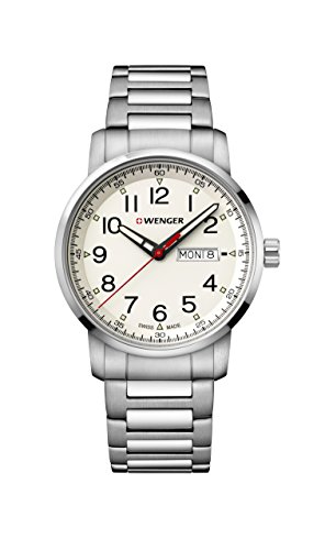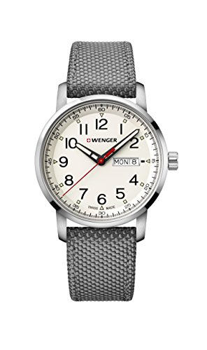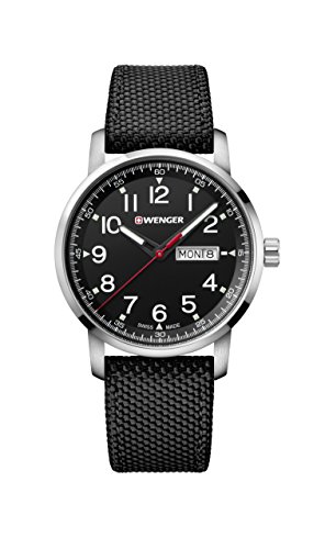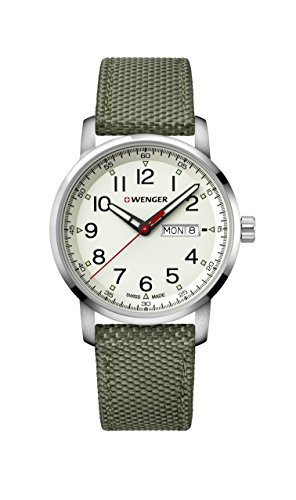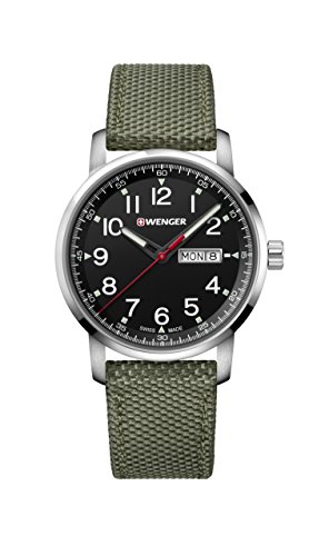 Wenger 01.1541.109 Attitude Heritage men's watch features a 42mm wide solid stainless steel case with a fixed bezel and textured push-pull crown. Wenger 01.1541.109 is powered by Swiss Made Ronda 517 quartz movement. This stylish watch also features a sharp looking black dial with white accents black luminous skeleton hands and Arabic numeral hour markers along with the day-date display functions, scratch resistant sapphire coated mineral crystal and water resistant to 100 meters. Wenger 01.1541.109 is equipped with a 22mm wide green nylon strap with a buckle clasp. Wenger 01.1541.109 men's Attitude Heritage black dial green nylon strap watch is brand new and comes in an original Wenger gift box and is backed by a 3 year limited warranty.