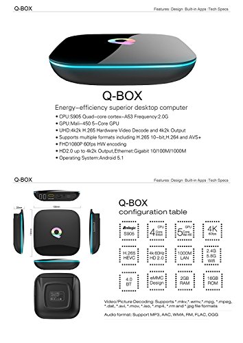 Model: Q Box Operation System: Android 5.1 CPU: S905X quad-core cortex-A53 ;frequency: 2.0G Decode Ability: 4k H.265 Remote Control: Included HDMI Output: 2.4G 5G wifi Bluetooth ap6330 Recording: No Lan: Ethernet:1000M, standard RJ-45 Connectors: HDMI Network: IEEE 802.11 a/b/g/n 2.4GHz WIFI Module: Dual channel WIFI 2.4GHz/5.0GHz Play APK install: Support DLNA,Miracast Protocol Support Decoder format: HD MPEG1/2/4,H.264, HD AVC/VC-1,RM/RMVB,Xvid/DivX3/4/5/6 ,RealVideo8/9/10 Support Media format: Avi/Rm/Rmvb/Ts/Vob/Mkv/Mov/ISO/wmv/asf/flv/dat/mpg/mpeg Support Music format: MP3/WMA/AAC/WAV/OGG/AC3/DDP/TrueHD/DTS/DTS/HD/FLAC/APE Support Photo format: HD JPEG/BMP/GIF/PNG/TIFF USB host: 2 High speed USB 2.0,support U DISK and USB HDD Card reader: SD/SDHC/MMC cards HDD file system: FAT16/FAT32/NTFS Support Subtitle: SRT/SMI/SUB/SSA/IDX USB High Difinition video output: SD/HD max.1920x1080 pixel LANEthernet: Gigabit 10/100M/1000M, standard RJ-45 Wireless: Built in WiFi Mouse/ Keyboard: Support mouse and keyboard via USB;Support 2.4GHz wireless mouse and keyboard via 2.4GHz