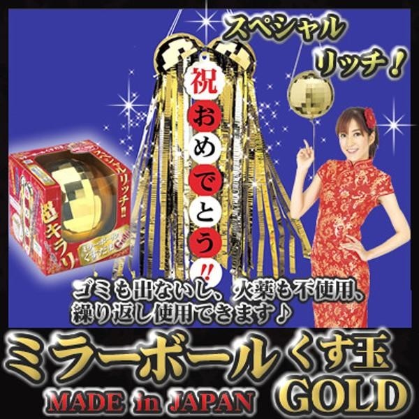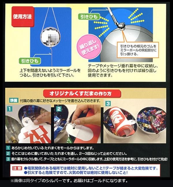 | ミラーボールの中身がくすだまになっており、「祝おめでとう」の垂れ幕とたっぷりの金銀メタルテープが入っています。使用後は中身を元に戻して何度でも使用でき、メッセージを書き込める無地の垂れ幕付きなので、オリジナルのくすだまも作ることができます。くすだま本体は、ミラーボールとしても使用可能。照明を反射してキラキラ輝くので吊しておくだけでもパーティー気分に♪ |