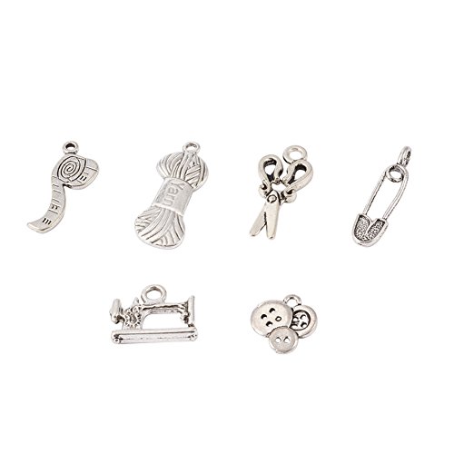 Pandahall 5Sets DIY Sewing Knitting Themed Tibetan Style Alloy Pendants, Scissor, Pipe, Safety Pin, Yarn Clew, Button, Sewing Machine Charms, Lead Free, Antique Silver, 6pcs/Set