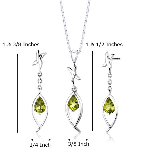 Earrings = Genuine Peridot, 2 pieces, Pear shape, 7x5mm. Earring Dimensions: 1 3/8 x 1/4 inch. Pendant = Genuine Peridot, 1 piece, Pear shape, 7x5mm. Pendant Dimensions: 1 1/2 x 3/8 inches. Earrings and Pendant have a total weight of 6.20 grams and are set in pure Sterling Silver Rhodium Nickel Finish with .925 stamp. Gemstones have a vibrant rich color and eye clean clarity. The Pendant and Earrings feature top quality workmanship and a beautiful finish. Includes Free 18 inch Sterling Silver Rhodium Nickel Finish Box Style Chain, Free Ribbon Gift Box.Feature