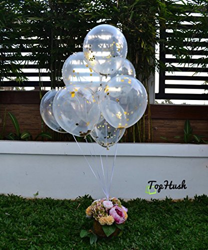 Product DescriptionMaterial: Latex Size: 12 inches Package: 10 clear balloons with gold confetti inside plus 1 mouth/tube 1cm sized confetti - 2.8 grams of confetti per balloon0