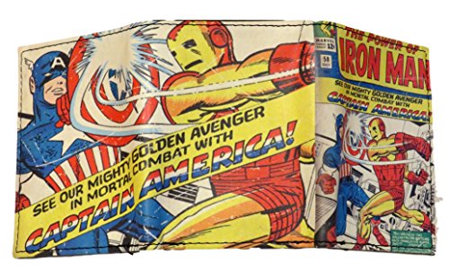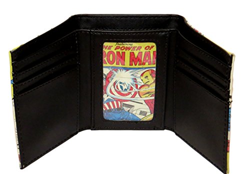 Product Description Superheroes unite to defend your belongings with this Marvel Comics Character Trifold Wallet. This officially licensed Trifold is crafted from leather. The interior features 6 card slots, 1 ID window, 2 utility pockets and a double currency pocket. Packaged in a Marvel gift box, this wallet is great as a gift for any comic fan! Measures 4" x 3" x 0.75" closed. 0
