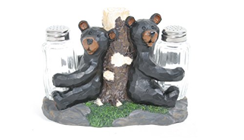 - Features two bears sitting up against a tree trunk holding a salt or pepper shaker