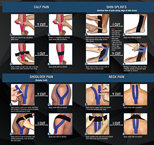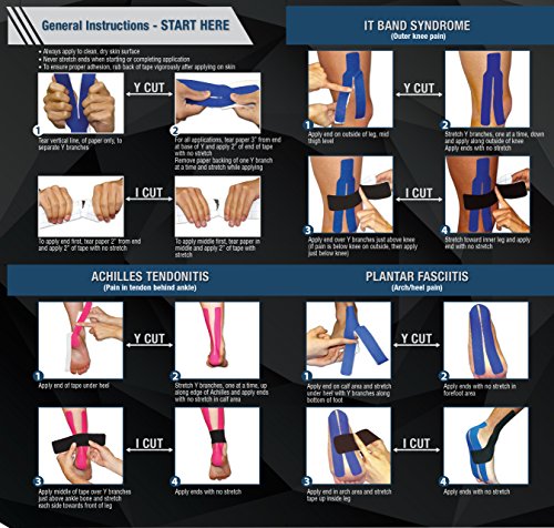 -. Feature : Effective relief for muscle tightness, knee pain, IT Band syndrome, shin splints, hamstring tears, plantar fasciitis, epicondylitis (tennis elbow), wrist pain and most soft tissue injuries. / Promotes circulation, reduces muscle fatigue. / Provides moderate soft tissue management. / Each package includes 20 pre cut pieces (10 straight cut pieces - 2" x 9", 10 pre cut Y strips - 2.375" x 9") / Simple application directions