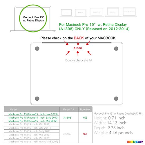 - Feature : The case only fits for Macbook Pro 15.6" with Retina Display (A1398) / Please kindly check the model number ''A1xxx'' on the back of the laptop BEFORE you purchase. / WARNING: This case can't fit Macbook Pro 15'' (A1286), Old Macbook with Silver Keyboard (A1260). / Case Dimension: 14.3 x 9.9 x 0.9 inch Macbook Pro 15'' with Retina Display Dimension: 14.13 x 9.73 x 0.71 inch / This product is sold exclusively by iBenzer. iBenzer, Inc. is the only authorized seller on Amazon. Only buy from iBenzer to get genuine iBenzer products with manufacturer warranty and superb customer service. Products purchased not from iBenzer, Inc. are counterfeit, we will NOT honor the warranty if the product was purchased from unauthorized seller.