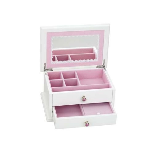 -. Feature : Pink fabric Framed round mirror, pirouetting ballerina / 1 drawer with secret compartment / White satin finish / Personalize with an engraved plaque of up to two lines of 20 characters each or a 3 letter monogram / 11 1/4 x 7 3/4 x 4 1/2" H