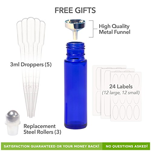 - FREE GIFTS IN EVERY BOX: All of our carefully packaged boxes comes with the addition of four complementary gifts. Included you will find: 5 droppers (3ml), a high quality metal funnel, replacement steel rollers (3), and 24 adhesive bottle labels (12 small, 12 large). These are just the tools to help you get the most from our product and help you jump right into enjoying these quality roller bottles.