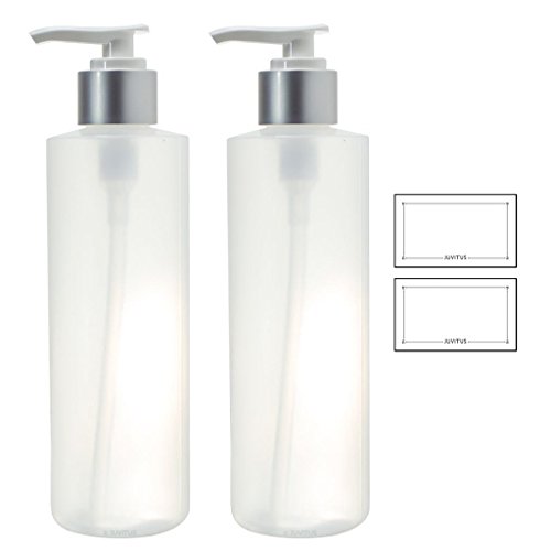 Clear Natural Refillable Plastic Squeeze Bottle with Silver Pump Dispenser - 8 oz (2 Pack) + Labels