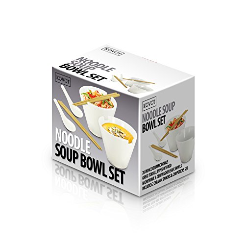 Up your Asian cuisine with the KOVOT Noodle Soup Bowl Set. Set includes: (2) 28-oz ceramic bowls, (2) oriental soup spoons, (2) sets of bamboo chopsticks. Ideal for Pho, noodle and Miso soups, but also great for many other types of food. The bowls are made of quality hand painted ivory-colored ceramic and feature a utensil resting groove across the top rim. The bowls are microwave and dishwasher safe, spoons hand wash recommended. Bowls Measure: 4 1/2"H x 5 3/4"W (at widest point)Feature