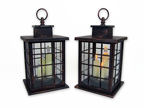 -. Feature : DISTRESSED BRONZE LANTERNS. Set of 2 decorative candle lanterns with LED taper candles attached. Cool mission design with 3 taper candles attached inside. On/Off button on the bottom with a timer. / MISSION LANTERN. What a great set of 2 lanterns that each have flameless, battery operated candles installed. Each candle runs on 3 AAA batteries and has a 3 way on/off switch with a 5 HOUR TIMER function. They are perfect to set it and forget it. They will come on every day at the same time once you set the timer. / COUNTRY STYLE RUSTIC LANTERN. These are the perfect color for your outdoor rustic wedding reception or party. THEY ARE AN ANTIQUE BROWN OR COPPER COLOR. Serves as lighting and decoration for yard, wall, pathway, driveway, shelf, table, bars, photo booths, patio, porch, etc. - A HANGING RING for easy hanging, or sits on a flat surface - Wireless & Lightweight (0.9lbs), convenient to carry around. / INDOOR/OUTDOOR LANTERNS. The LED candles have a nice, soft, warm flickering glow. Since the candles are flameless they are smoke free and worry free. Safe to use around pets and children. Perfect for those night sitting out on the deck, by the beach or at the lake. Each lantern comes with a loop at the top so you can hang it anywhere or it can sit on a flat surface. / LANTERNS. Each one of these lanterns measure approx. 9 1/2" tall but 10 1/2" when the loop is up and 5 1/2" wide. Battery operated lanterns (batteries not included)