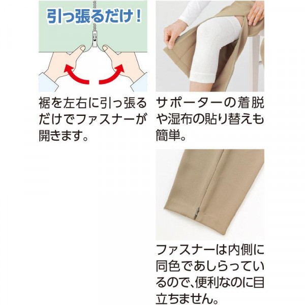| 診療所などで足を見せる時、裾をまくるのは大変。そんな悩みを解決!面倒だったパンツの着脱をしなくてもスッとファスナーを降ろすだけでOK。湿布やサポーターをするときも便利です。ファスナーは内側に同色であしらっていますので、普段は目立ちません。見た目は通常のパンツなので、おしゃれに軽やかに装ってください。シルエットの美しさも自慢です。 |