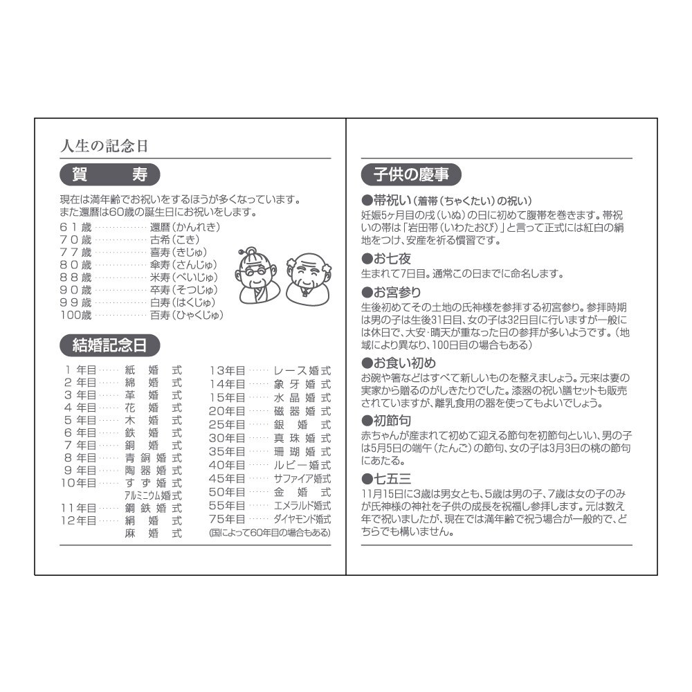 A convenient appendix such as a contact memo, a timetable, an anniversary list, a chart of age quick reference, etc. is also substantial.