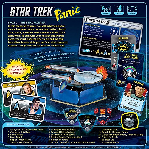 Star Trek panic is a cooperative game where players take on the roles of the original crew members of the USS Enterprise. To win the game, players must successfully complete five missions and then clear any remaining threats from the game board, all while keeping at least one section of the hull of the ship intact. If at any point all six sections of the Enterprise are destroyed, players lose the game.Feature