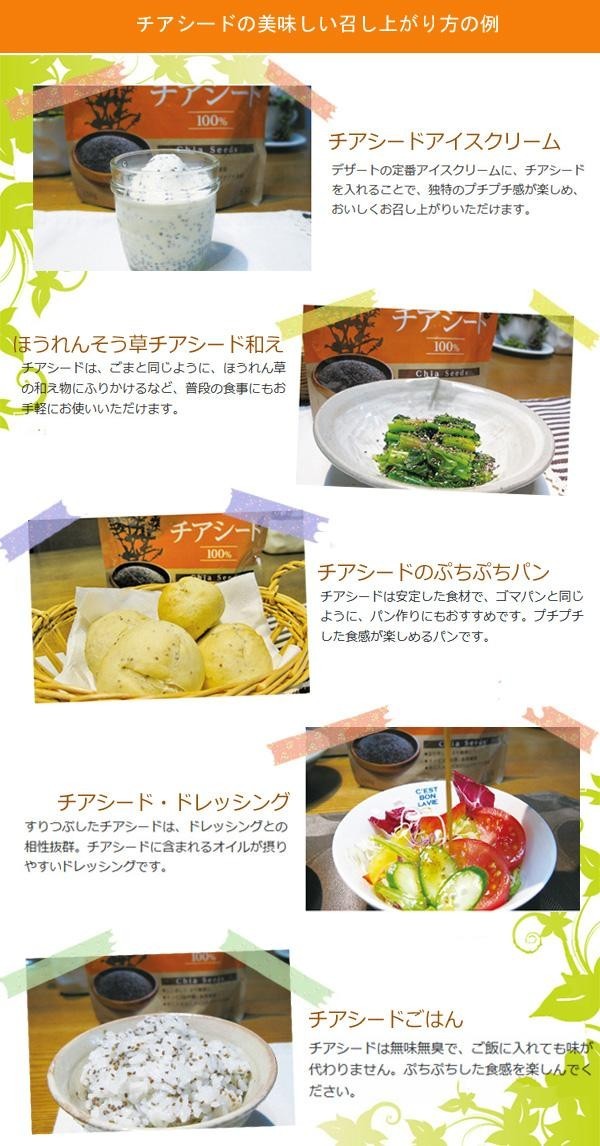 | ●植物性タンパク質、豊富な食物繊維、ミネラル、そして日本人に不足しがちなオメガ3脂肪酸を含みます。 | | ●水に入れると膨らむため腹持ち◎無味無臭なので料理の味を邪魔せず、プチプチの食感が楽しめます♪ | | ●安定した食材なので、ごはんに混ぜたり、ドレッシングやパン作り、和え物等アレンジ自在☆ |