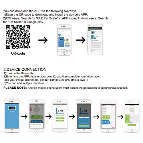 Please Read Below Massage Before Use: 1. Download App freely from QR code in the back of fat scale or instruction sheet. 2. Finish your personal information and you can test other items, or just weight. 3. Choose the "Unit" as you want (St, Kg and Lb), stand on the scale to record the number.