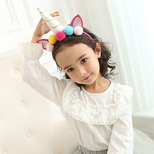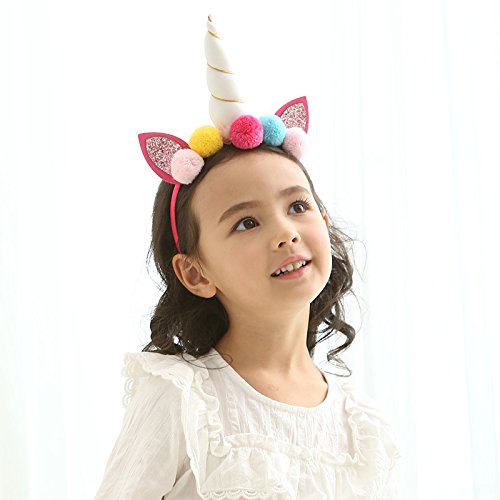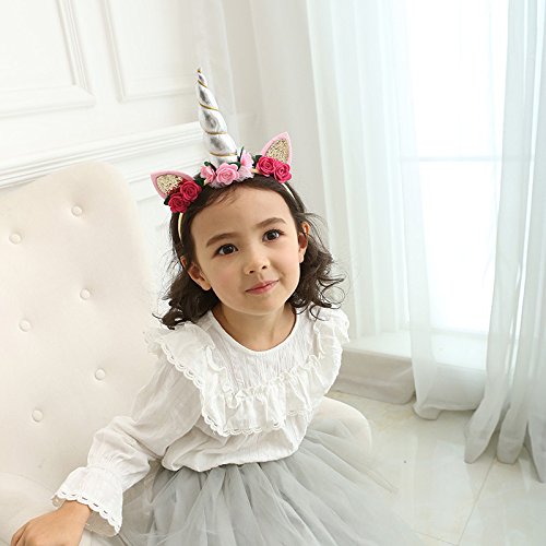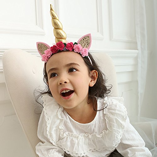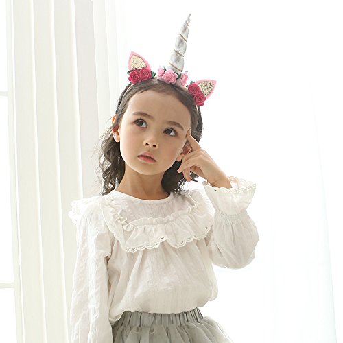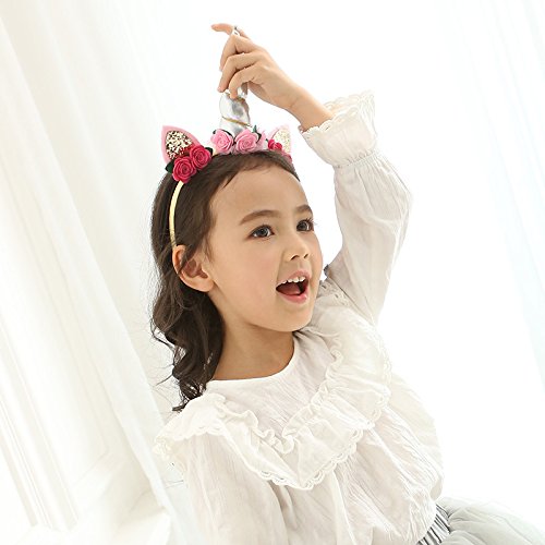 -. Feature : Headband size: 4.5 " x 5.5", horn length: 4.7", suitable for both babies and kids / Handmade party headbands are beautiful and durable, comfortable for kids to wear, soft cloth covered head hoops won't hurt your head / Designed with rose flowers, glitter ears and pompom, these unicorn horn headbands are cute and magic, make you shine in your cosplay makeup christmas or birthday party / Three styles available, white horn headband, silver horn headband, gold horn headband, choose which one you prefer / Also can be a cute photo props