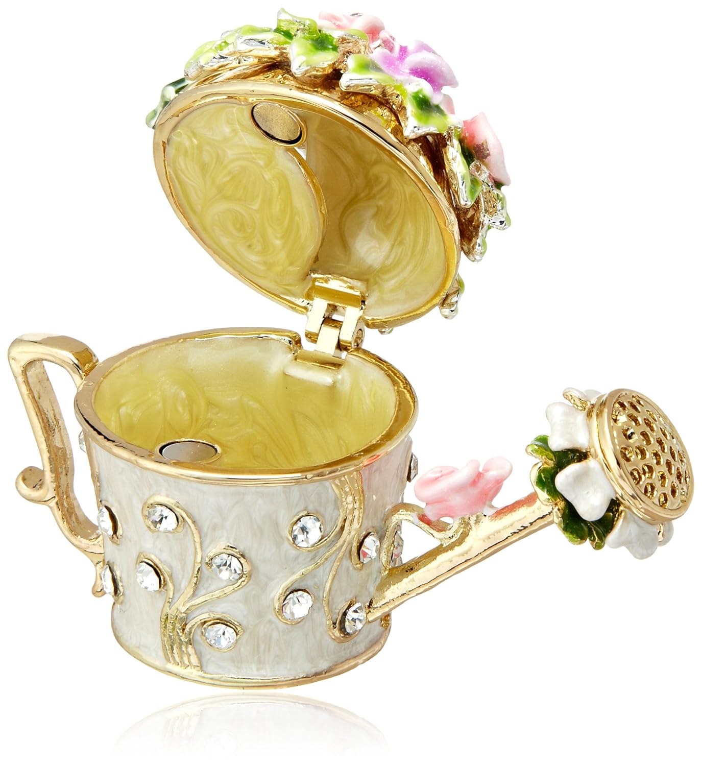 カラフルなお花がいっぱいのジョウロにカエルのケロがちょっぴり顔をのぞかせた、とってもキュートな小さな小物入れ。大き目のクリスタルを贅沢に使用しているので、より一層メルヘンな雰囲気がいっぱいです。カエルは縁起物としても人気で、なおかつ可愛らしい雰囲気なので贈り物にもおすすめです。