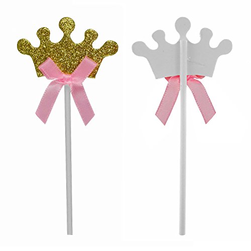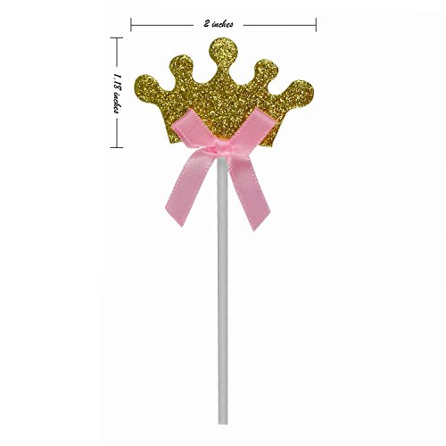 - Glitter Gold Crown Cupcake Toppers: Crown cupcake picks size approx. 1.18 * 2 inches (3 * 5 cm), with pink bow and paper stick.