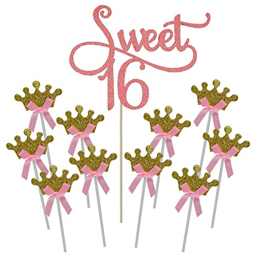 - Sweet 16 Birthday Party Supplies: Sweet 16 decorations includes 1 pink " sweet 16 " monogram cake topper, 10 gold crown cupcake picks, a total of 11.