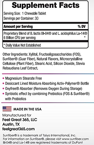 Exceeds 6 Billion CFU per Serving of a Proprietary Blend of Bifidobacterium lactis and Lactobacillus acidophilus Other Ingredients – Xylitol, Fructooligosaccharides (FOS), Sunfiber® (Guar Fiber), Stevia Rebaudiana Leaf Extract, Microcrystalline Cellulose (Plant Fiber), Stearic Acid, Silicon Dioxide and Natural Flavors 6 Billion Active Microflora per Serving (1 Chewable Tablet) Store at Room Temperature, no refrigeration necessary. Non-GMO, Gluten Free, and Non-Dairy No Magnesium Stearate, No Soy, No Sugar, No Wheat, No Eggs, No Yeast, No Salt, No Animal Derivatives, No Artificial Flavors or Preservatives