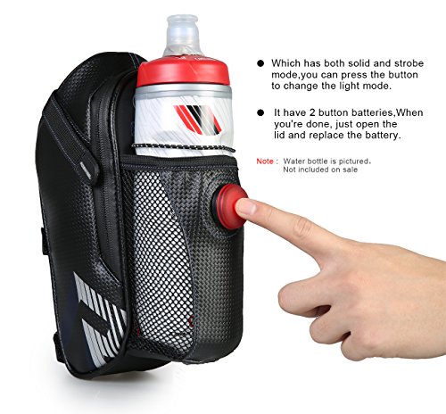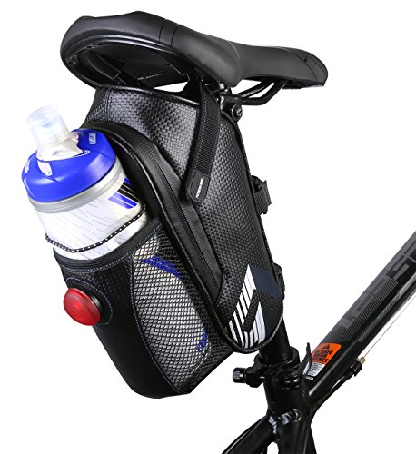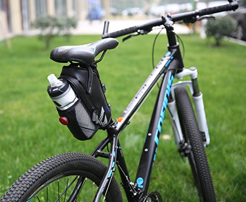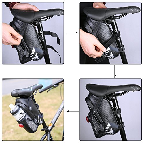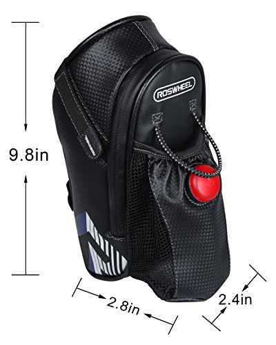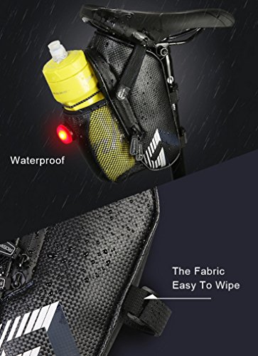 Reason why you choose Lulutus saddle bag 1.The bicycle bag made of high quality carbon fiber materials and water-resistant zippers,That you can use it long time.And the bag provide a roomier space to store your items. 2.A net pocket extend the pocket of the bag,it could store items such as water,drinks,tool kits and so on.To solve the problems while you are cycling.This premium design suitable for riders perfectly. 3.The saddle bag is all-around waterproof with high quality waterproof material and taped zipper,which provide a complete protection for items in bag,and it is very easy and convenient to clean out by wiping the surface. FEATURES - Reflective strips afford easy recognition visibility and safety in low light and at night. - the positioning, hanging down--more compact against the bike, easier to peer in and get appropriate gear. - storage space: 1.6 liters: good for safety/maintenance and storage of keys/wallet. - bonus light is nice feature--both solid and strobe mode. - Universal style with small size which is available for a variety of bicycles and outdoor cycling,like MTB,mountain bikes, trekking bikes,folding bikes and road bikes. SPECIFICATIONS 1. Size: 2.4" L * 2.8" W * 9.8" H 2. Weight: 200g 3. Capacity: 1.6L 4. Material: Leather 5. Color: Black 6. Type: Saddle/Seat bag 7. Installation: Strip with buckle,velcro strips TIPS 1.Please note the mesh pocket could store the bottle with approx maximum diameter of 2.6 inch. 2.The height of the bag is 9.5 inch,please note whether the bag fit your saddle bike. 3.The zipper of the waterproof saddle bike may be not so sooth because there is a waterproof coating material on the zipper.