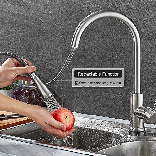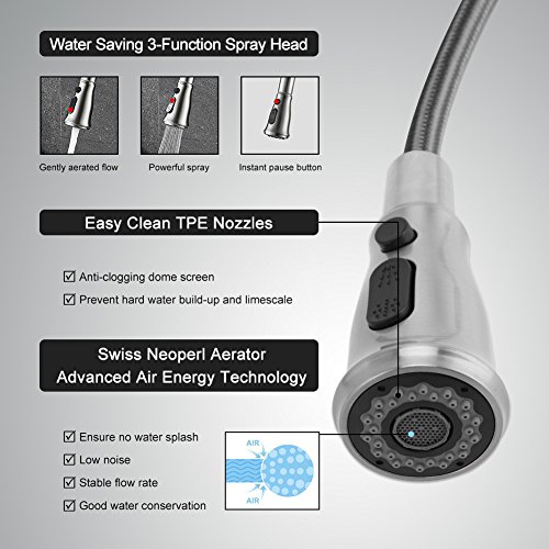 Three-function Spray Patterns on faucet sprayerhead: steady steam water, powerful rinse water and instant pause water. ★ Two spray buttons design helps you save water greatly. Press the round pause button when not in use immediately and switch the spray modes when you wash different items from vegetable to heavy-duty applications. ★ The pulldown design also allows for 360 degree extended easy access to your sink.