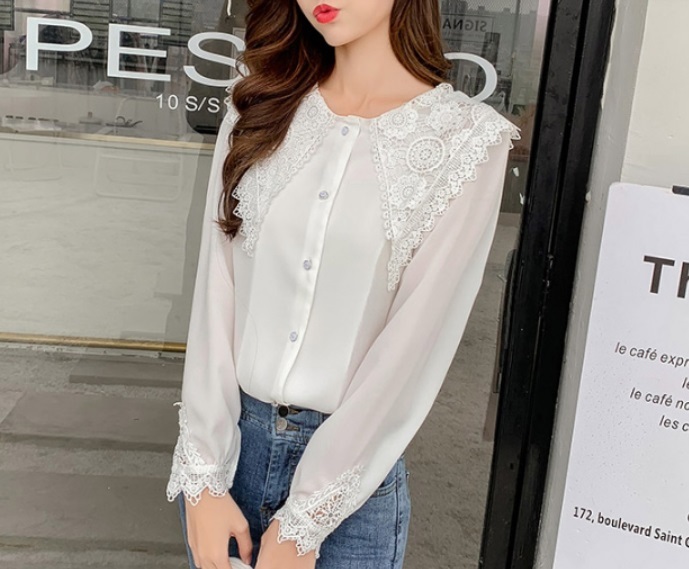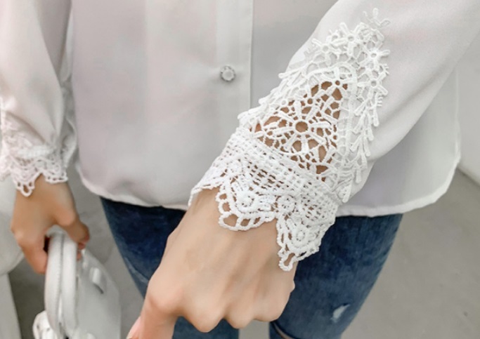 大きめの襟と袖口はレース仕様で、上品な着こなしに仕上げてくれます。