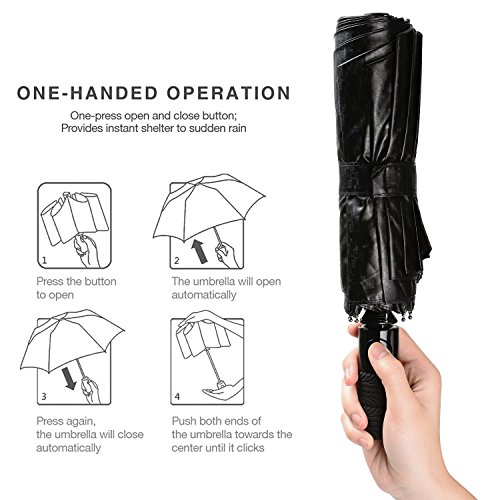-. Feature : WINDPROOF 10-RIB CONSTRUCTION - More ribs means more stability, most travel umbrellas are made of 6 or 8 ribs nowadays, the AUOPLUS is fortified with 10 resin-reinforced fiberglass ribs with stainless steel shaft, making it the strongest wind-defying brolly under $30 on the market / PORTABLE COMPACT SIZE - The large folding umbrella folds down to a compact size(12.6'' in length) making it perfect for keeping in the car or your bag for those unpredictable downpours; yet opens to form a large 42" canopy, offering better coverage and more wind resistance / AUTOMATIC OPEN & CLOSE - Spring-loaded automatic mechanism springs open at the press of a button and closes with a push of the same button, then manually push the shaft back down to it's travel mode; if you're carrying groceries, a purse, a briefcase, or a child in one hand, it's handy to be able to snap your umbrella open or closed with the other / SHELTER FROM RAIN & SUN - Made of high quality 280T water repellent pongee fabric with UV protection coating, this parasol not only protects your torso and head from precipitation in the windiest of conditions, but also blocks out the sun in hot summer; plus a waterproof storage sleeve will definitely keep your bag dry / BUY WITH CONFIDENCE - We believe our umbrella is built to last, but just in case it doesn't meet your requirements, we offer a full refund for the first 60 days and a 36 MONTH REPLACEMENT WARRANTY, if the umbrella itself goes wrong, we will send you a replacement with no extra charge