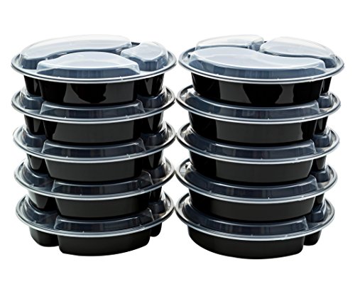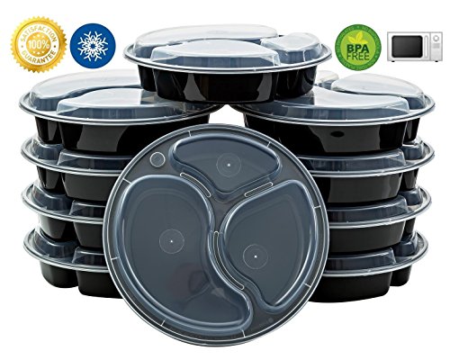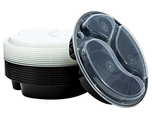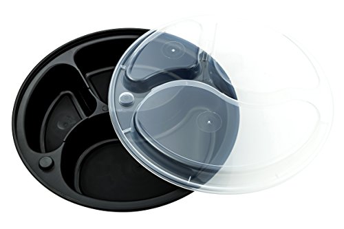Green Direct Microwave Safe 3-Compartment Round Food Containers with Lids/divided Plate/bento Box/lunch Tray with Cover, Black Bottom with Clear Cover Pack of 20