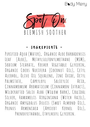 -. Feature : WHAT IS THE SPOT ON BLEMISH SOOTHER? This drying lotion is Body Merry's acne, pimple, blemish, dark spot and scar fighter. / WHO IS THE CREAM FOR? Our spot balm is perfect for anyone with breakouts and isolated zits or dark spots and scars they leave behind and doubles as a great preventative spot minimizer. / WHAT TYPE OF INGREDIENTS ARE IN IT? We blended this cream with MSM, Zinc Oxide, Cinnamon Extract & Salicylic Acid to help target those facial spots at the source. / WHERE CAN I USE IT? You can use it on your face, neck, chin or even chest and back - anywhere you feel a breakout coming on or have an existing mark, spot or blemish you need a little help with. / Body Merry offers a 90-day MANUFACTURER GUARANTEE on all its products (no need to return the bottle). Our products are CRUELTY FREE and are manufactured in the USA.