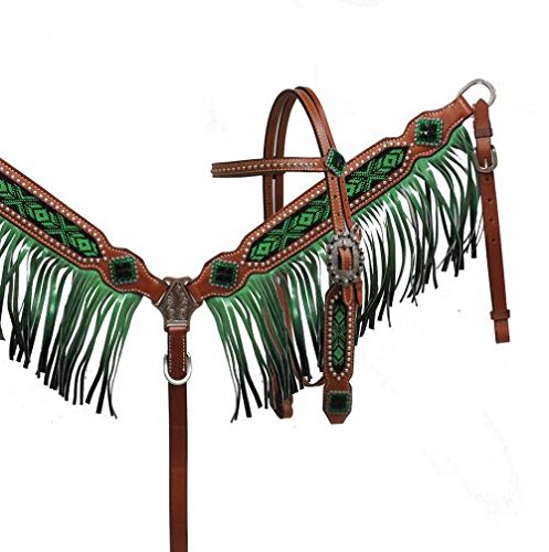 Studio : Showman Publisher : Showman Binding : Misc. Product Description Showman® Beaded headstall and breast collar with ombre fringe. This set features a medium leather accented with a beaded inlay and is accented with color ombre leather fringe. Headstall comes with 5/8" x 7' leather split reins. 0