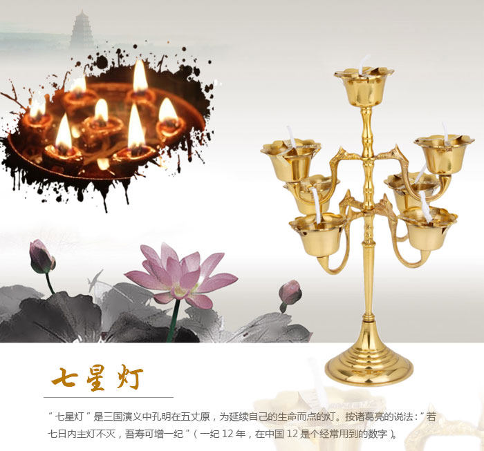 Product features: "Star?light"?Kong Ming?in the romance of the Three Kingdoms?in the fiveZhang original?point,?and?to extend their?life lamp.?According to Zhu Geliang:?"if the seven?days?the main?lamp does not go out,?my?life?can increase?a?Ji"?(a?period of?12 years,?in?Chinese?12?is a frequently useddigital). Product?introduction: Name:?seven lights Material:?Copper Size:?styles:?the maximum diameter of about 20cm*?high 22cm Styles?two: maximum?diameter of about?20cm* high?29.5cm Styles?three: maximum?diameter of about?27cm* high?32.5cm Weight:?about 0.79kg?styles?styles?of about two?0.84kg Styles?ca. three?1.6kg?(net) Packaging: general packaging |