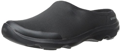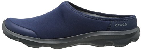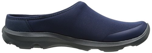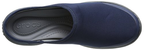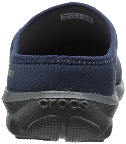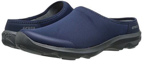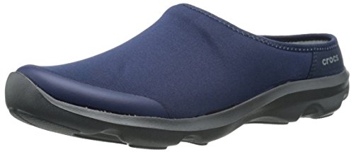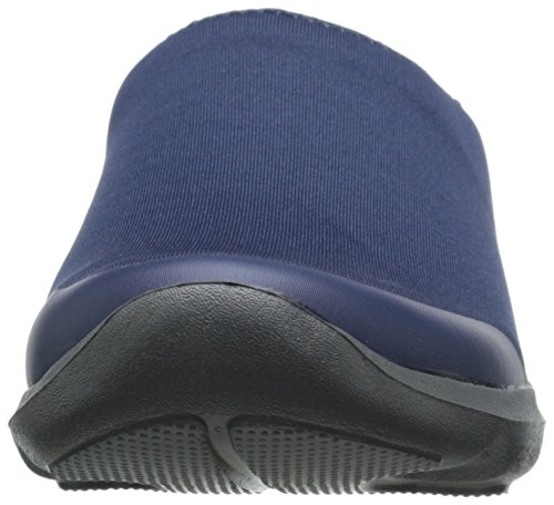 Features. Busy Day functionality and comfort in a versatile mule. Versatile and flexible fabric uppers - feel like yoga pants. Soft ergonomic foam footbeds feature added arch support and cushioned heels. Rugged slip-resistant non-marking croslite material outsoles. Color - Navy Graphite. Size - 9 MFeature