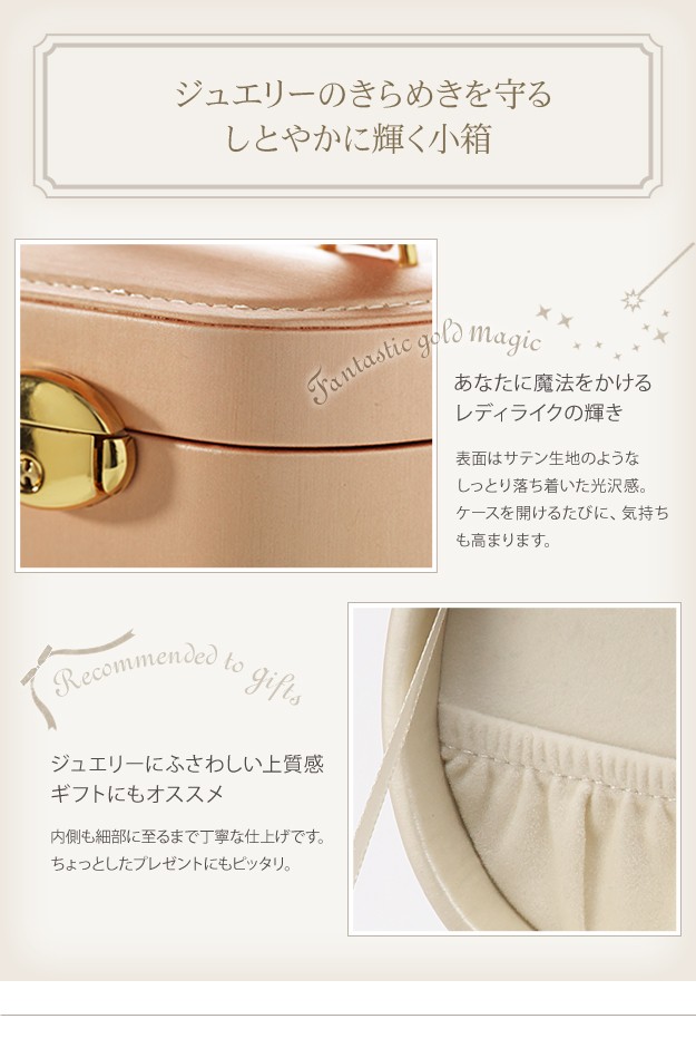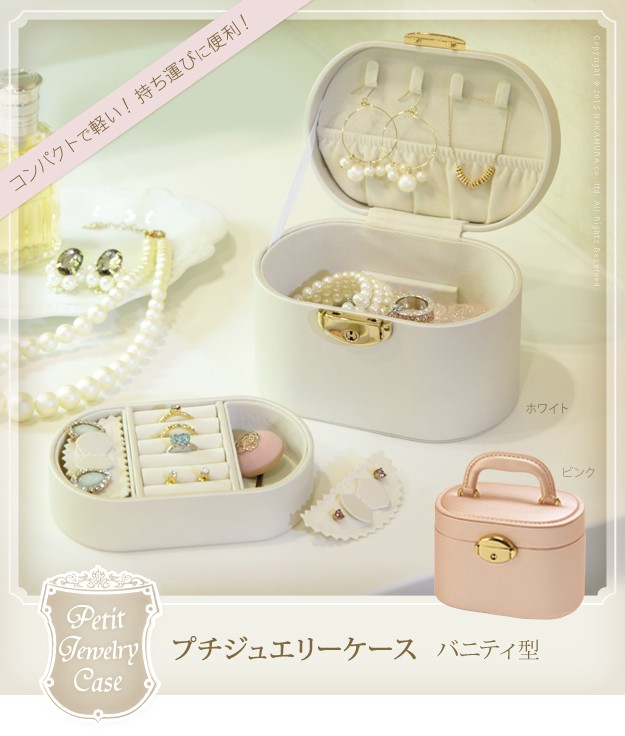 ※メーカー直送のため代金引換はお受けできません。※沖縄・一部離島は別途送料がかかります。お見積もりいたしますのでお問い合わせ下さい。商品について:取り外せるトレイが付いた2段ジュエリーボックスです。コンパクトながらも収納力は高く、15点~20点ほど入れることができます。お手持ちのアクセサリーが少ない方はもちろん、仕事中や旅行先などちょっと外しておきたいときにも安心して収納。光沢のあるソフトな色合いのケースは上品さもあり、贈り物としてもお勧めです。サイズ(cm):幅13.5x奥行10.3x高さ9.8cm・約400g下段内寸:幅12.5x奥行7.5x高さ6cmトレイの深さ:2.3cmフタ裏ポケットの深さ:3.3cmフック:4本ピアスホルダー:穴2つ×2枚鍵付きカラー:ピンク・ホワイト材質:外貼り-合成皮革(PVC)、内貼り-スエード調完成品株式会社ナカムラ(12700005)