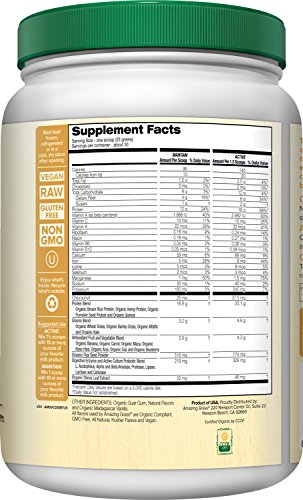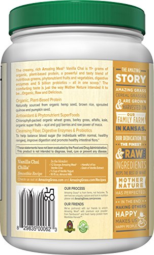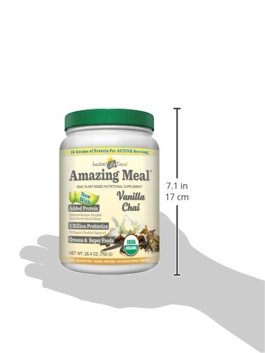 - Feature : Gluten Free and Vegan / Amazing Meal combines our signature grass blend with 11+ grams of plant-based protein, 4 grams of fiber, and 5 billion probiotics into each delicious serving. / USDA Certified Organic, Vegan, Gluten Free, Non GMO, Kosher, Raw / The perfect blend of rich, creamy vanilla and exotic chai spices. / Mix one serving with 10 or more ounces of water, juice, or mixed into your favorite smoothie! / 30 servings, 26.4 ounces