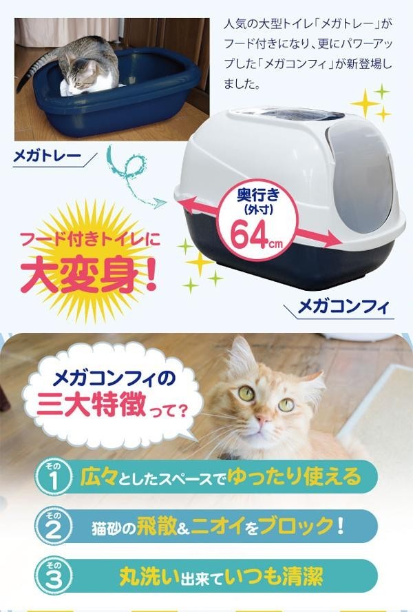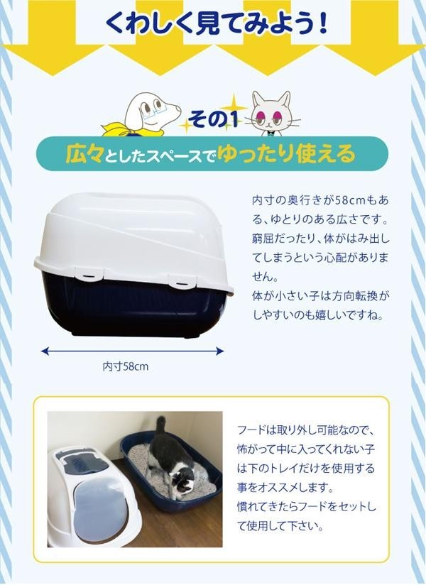 | 内寸の奥行が58cmもあるので、広々としていてゆとりのある広さです。フードと扉も付いているので、砂をかいても外に飛び散らず、ニオイも外へ漏れにくくなっています。さらに、活性炭フィルターがイヤなニオイを和らげます。バックルを外すと、上下に分かれるので、隅々までキレイに洗えます。 |