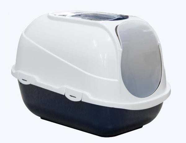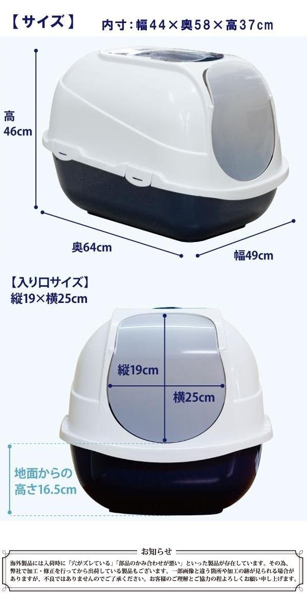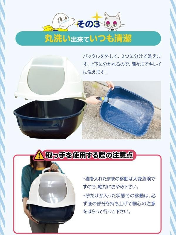 内寸の奥行が58cmもあるので、広々としていてゆとりのある広さです。フードと扉も付いているので、砂をかいても外に飛び散らず、ニオイも外へ漏れにくくなっています。さらに、活性炭フィルターがイヤなニオイを和らげます。バックルを外すと、上下に分かれるので、隅々までキレイに洗えます。 |