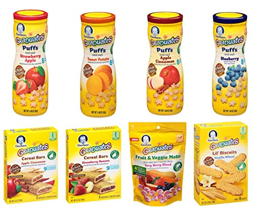 A fun filled variety pack of snacks for your active infant or toddler! Includes 4 Puffs: Sweet Potato, Strawberry Apple, Blueberry, Apple Cinnamon; 1 box of Strawberry Fruit and Oats Bars; 1 box Strawberry Fruit Strips; 1 box Lil' Biscuits.Feature