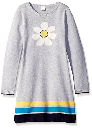 Grey cotton dress with daisy intarsia and stripe detail at bottom