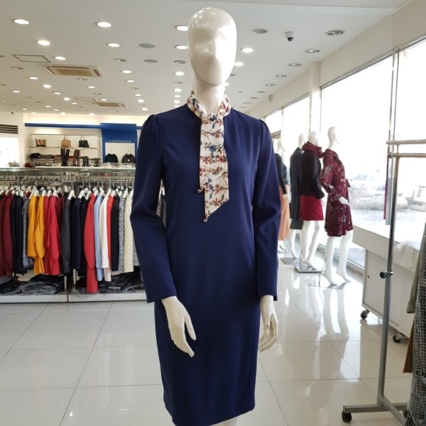 스카프 장식의 나팔소매 H라인 원피스-JA8S3-WOP220-블루
