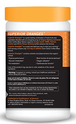 Studio : Food Science of Vermont Publisher : Food Science of Vermont Binding : Health and Beauty Product Description Superior Oranges is a delicious energy drink mix to support endurance and cognitive function.* Green Coffee Bean extract provides natural caffeic and chlorogenic acids to support energy levels without the negative effects associated with caffeinated beverages. DMG, Taurine, Inositol and White Panax Ginseng further enhance this fast-acting formula. Superior Oranges is a smart and delicious way to start your morning. 0