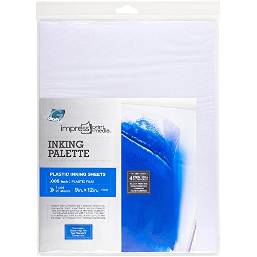 Grafix-Impress Inking Palette Pad. Perfect for block printing monoprinting stamping and hand painting! A smooth nonporous disposable plastic sheet that is quick and easy to use. Sheets are gummed at two ends to prevent curling when rolling ink with a brayer. They are convenient and ideal for easy clean up- just tear the sheet from the pad when finished and discard. Stable (lays flat) and tear resistant plastic film. This package contains one 12x9 inch pad with twenty-five .005 inch thick plastic inking sheets .004 Inch thick. Made in USA.Feature