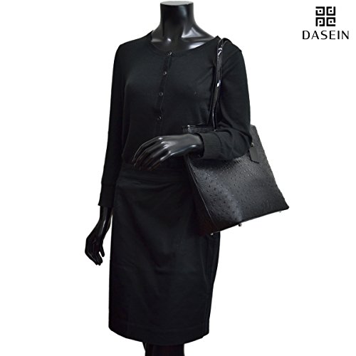 [Design]: Dasein logo emblem hanging at front. Sleek zipper closure in matching color on top. Protective feet at bottom. Dual shoulder straps in faux patent leather and buckle details