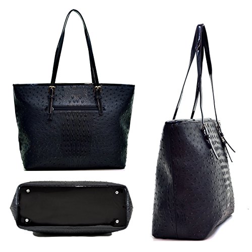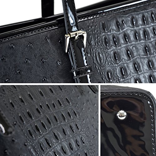 [Material]: High quality faux ostrich leather with faux patent leather trim. Silver tone hardware. 100% no chemical smell thanks to our strict check and handcraft