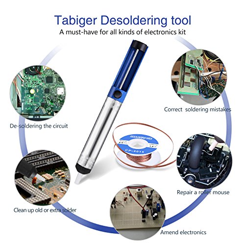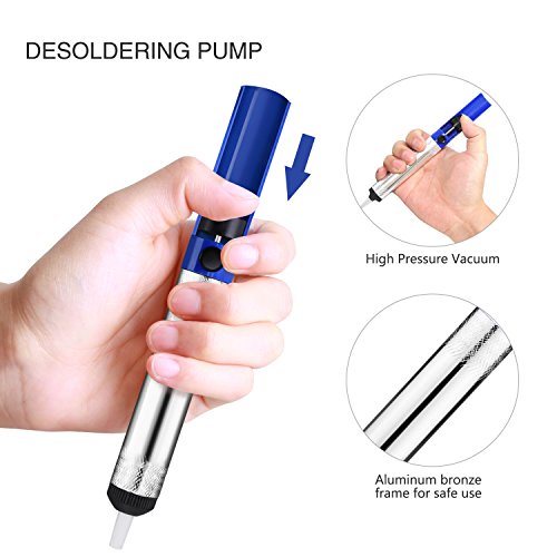 - 【Durable desoldering iron kit】 The body of desoldering pump is made of aluminum, which can resistance to beat, corrosion and have good heat dispersion, the desoldering wick has geometrically-precise weave with copper and rosin, which show no nicking or bending after a long time.