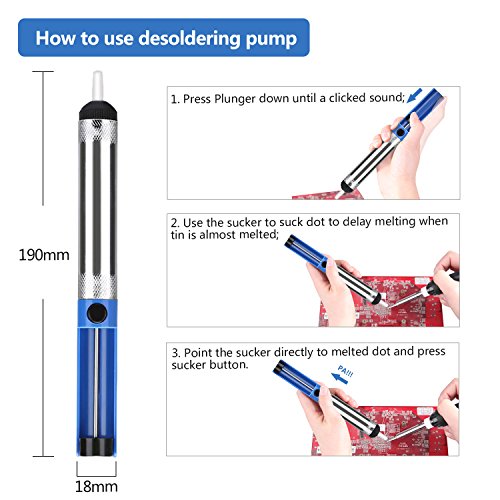 - 【Powerful suction Solder sucker】 The solder sucker has an aluminum bronze frame and a high pressure vacuum which can remove solder from a printed circuit board effectively.