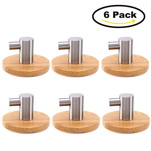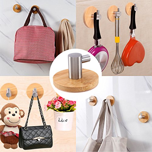 HoDrme Bamboo 3M Self Adhesive Hooks Heavy Duty Stainless Steel Wall Hooks Robe Coat Hat Bags Keys Hanger in Kitchen Bathroom Bedroom Office Toilet Living Room-6 Pack