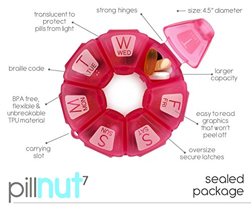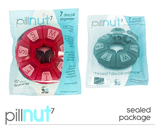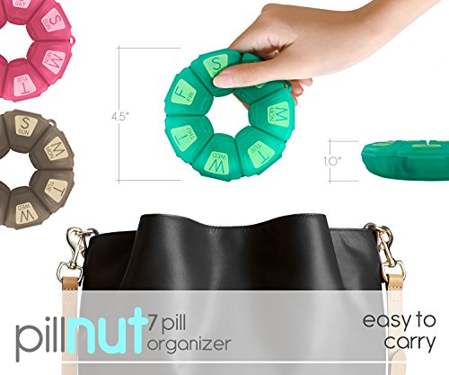 STORE A WEEK'S WORTH OF MEDS IN PILLNUT7 PILL ORGANIZER! Most pill planners available on the market are cheaply made, easily breakable and can even be harmful to your health. Does your pill case too looks cheap and has a strange chemical smell that you can even taste when taking your pills? Or, is it quite small, so you can't fit in all the different sized pills you need every day and need a second one just for the larger ones? If you said yes to the above questions, it's the right time to replace your existing pill box case with a safe and practical solution. Introducing ?THE GINER'S PILLNUT7 7-DAY PILL ORGANIZER? Pillnut7 is a unique circular pill reminder with advanced features you won't find in any other brand. It is the result of top product designers and medical professionals combined to create a weekly pill organizer that is easy to use, free from toxic plastic substances and built to last. WHY DO WE STAND OUT FROM THE COMPETITION? ? BPA free and made from ultra-durable and flexible TPU material that is unbreakable. ? Large printed days with Braille dots on each compartment. ? Easy to load, large pill compartments. 4.5 inches in diameter and 1 inch height. ? Each compartment has durable reinforced hinges to prevent breakage that also help secure against accidental spills. ? Comes in a hermetically sealed pouch ensuring highest quality control standards. ? The compartments are translucent rather than transparent, so it makes the content visible yet protecting pills from direct sunlight. ? Comes in 3 cheerful colors, Aqua, Rose and Grey with built-in carrying hook. ? A perfect gift for anyone who's on daily vitamins, supplements or medications. ? Not absolutely satisfied? Just return and enjoy a complete refund or a BRAND NEW replacement. SO WHY WAIT? CHOOSE US NOW! 0 |